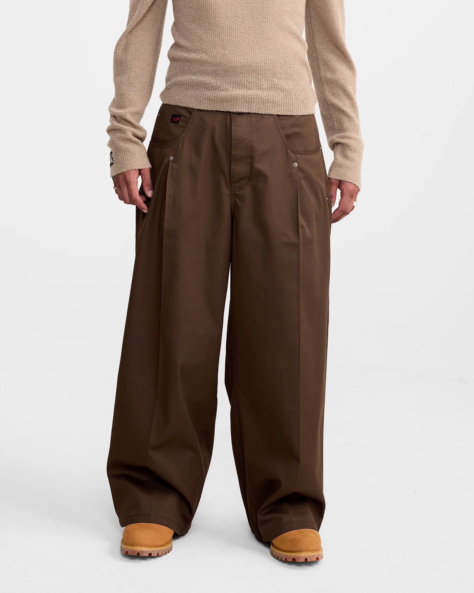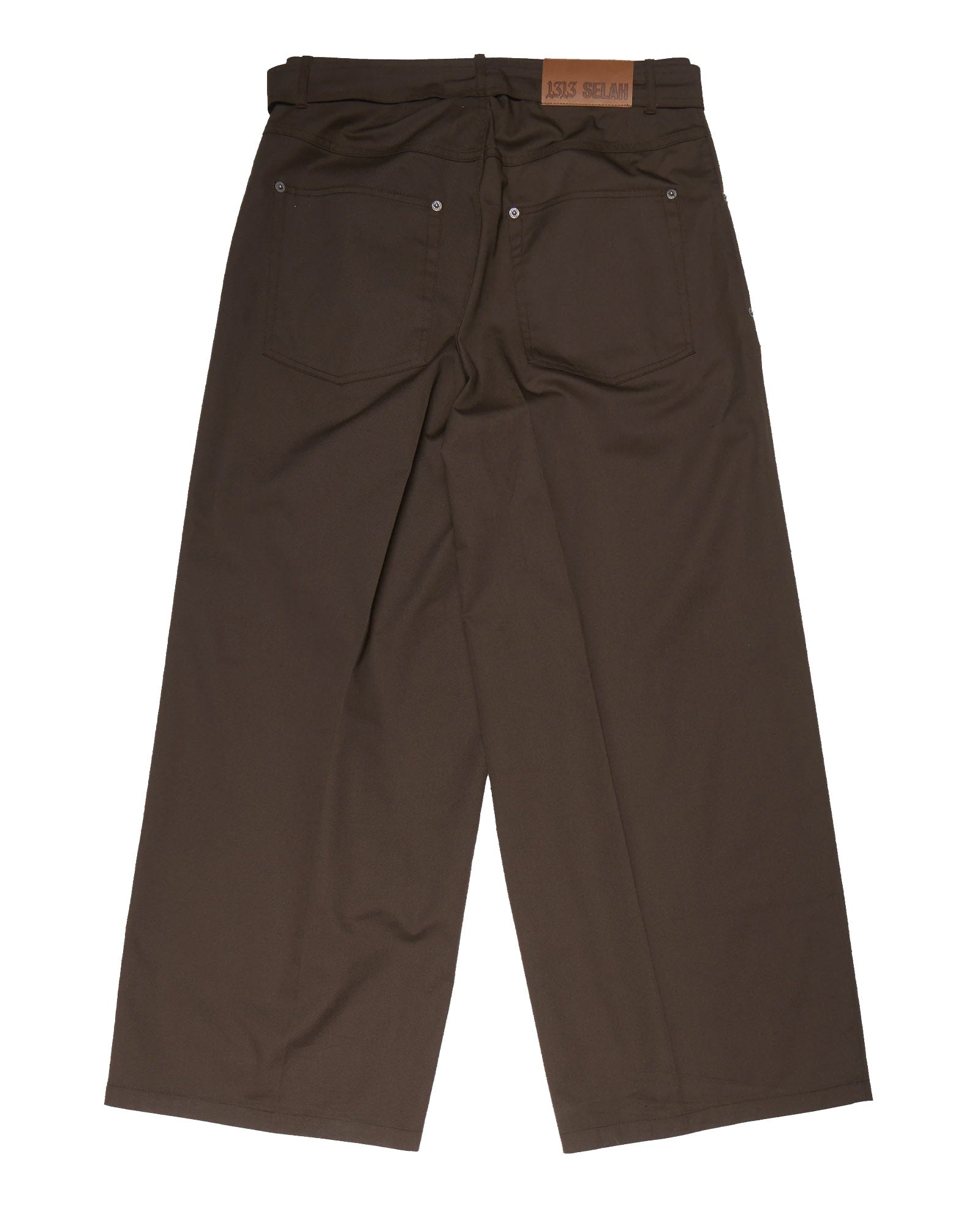 1313 SELAH Maximo worker pant is a five pocket pant that comes in a dark brown color. The pants has a extra wide fit with one pleat and and comes with a self-fabric belt with "S" embroidery on belt. The shank buttons and rivets features 13 branding with an aged silver finish. The tan PU leather patch at waistband has a blind debossing of the 1313 SELAH logo.